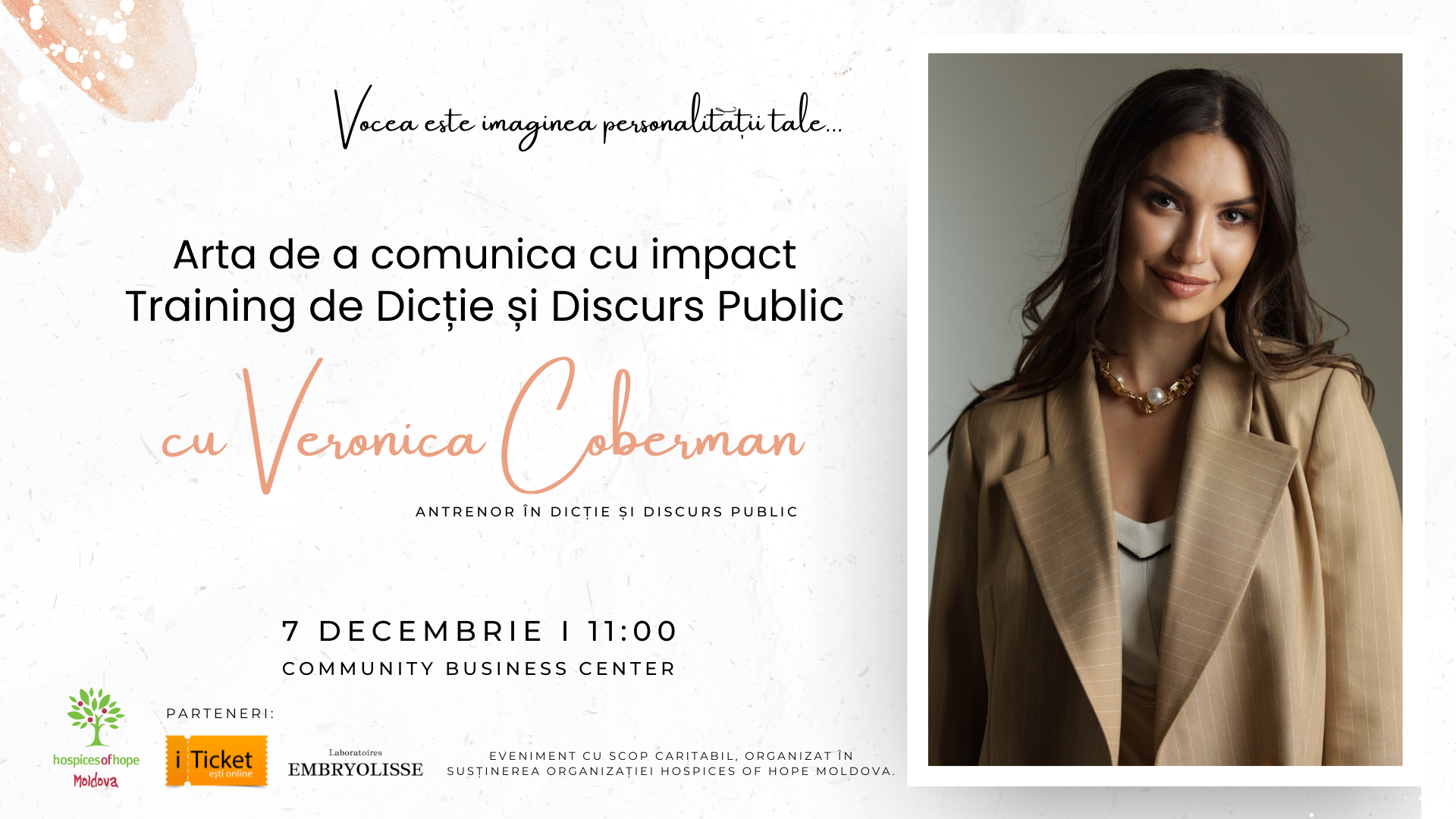 On Saturday, December 7, we warmly invite you to an unique event, led by Veronica Coberman, a diction and public speaking coach, dedicated to the art of communication, under the theme „Your voice is the image of your personality.”
