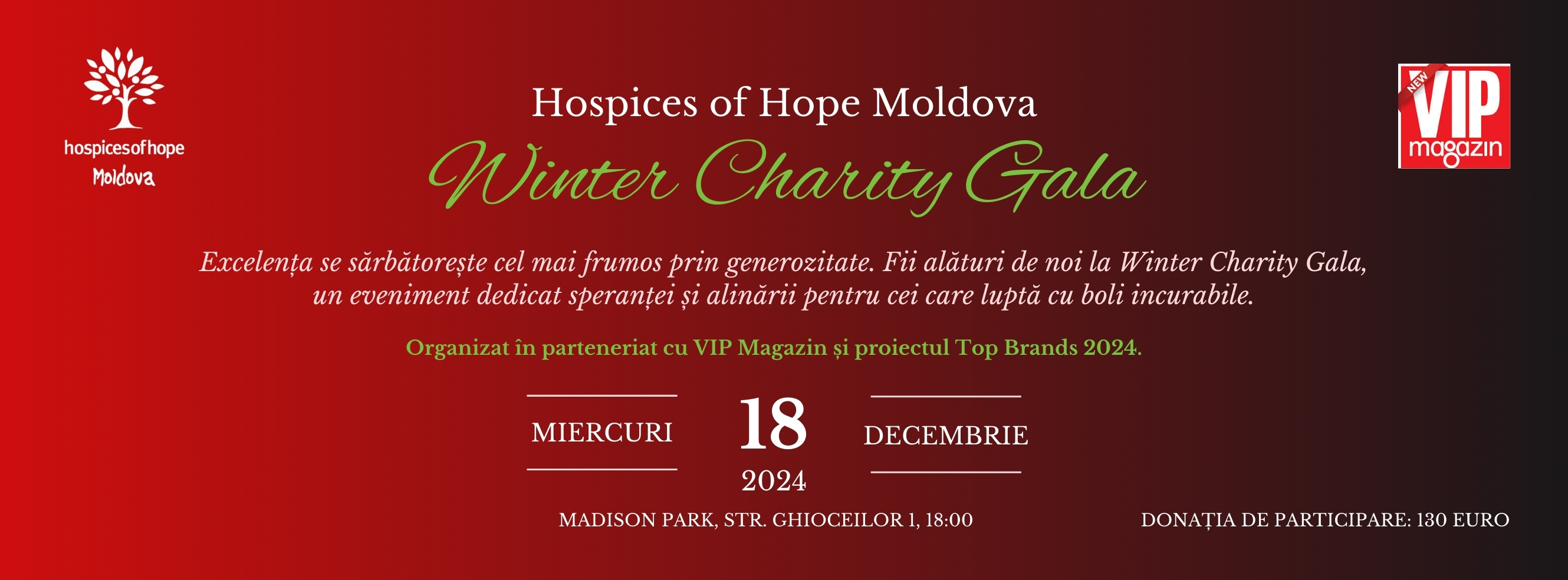 Hospices of Hope Moldova, with the support of VIP Magazin, is honored to invite you to an extraordinary evening, dedicated to hope and comfort for those battling incurable illnesses. On December 18, 2024, at Madison Park, we invite you to join us for the traditional Winter Charity Gala, held for the first time alongside the TOP BRANDS 2024 event.